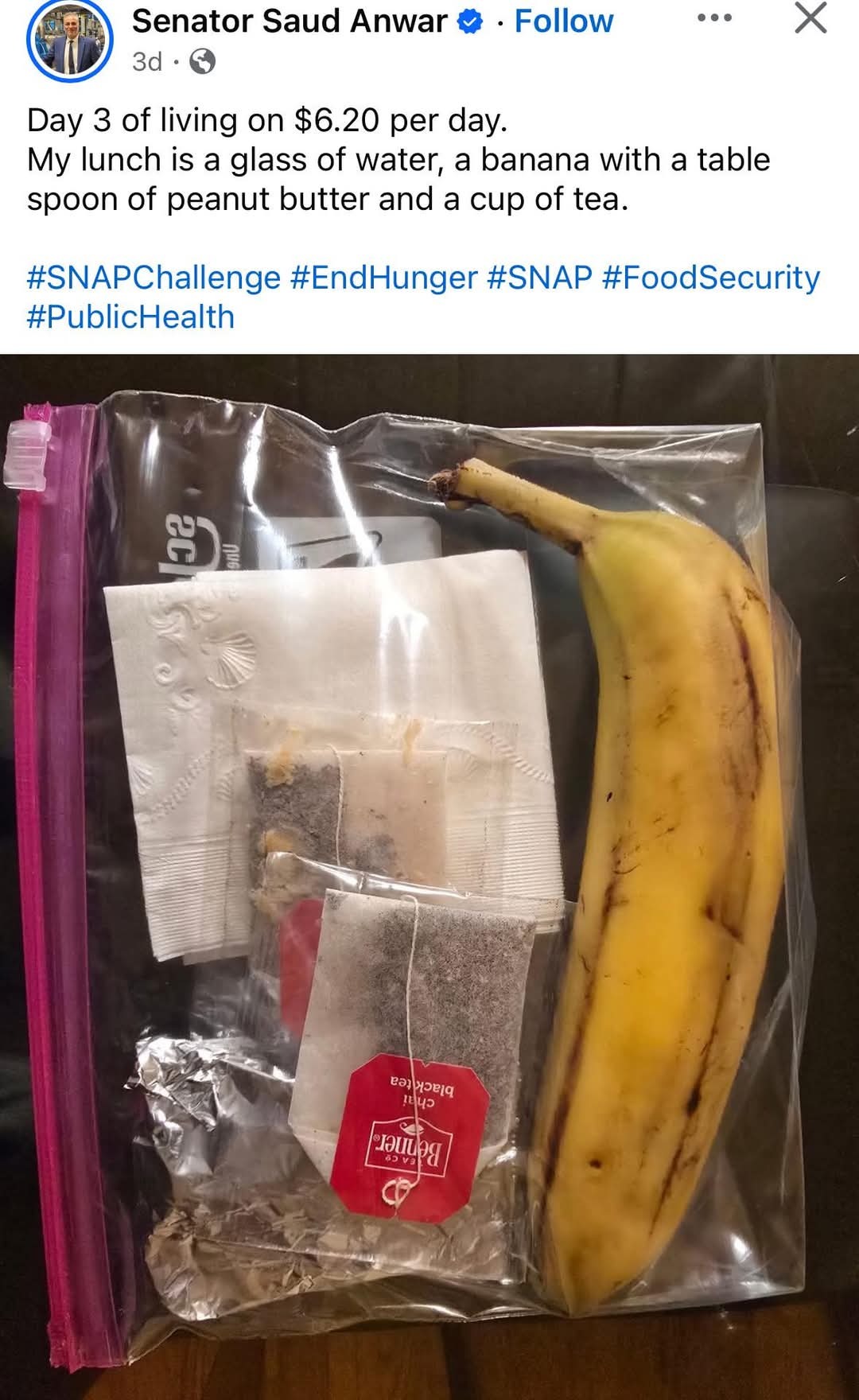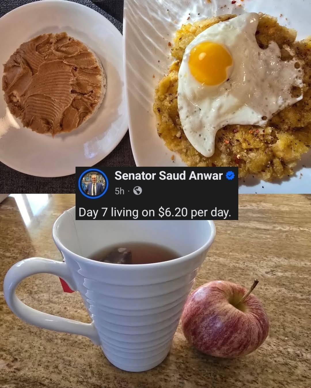 Senator Anwar has been doing the #snapchallenge, sharing his $6 meals everyday to share what it looks like living off a low income daily food budget.